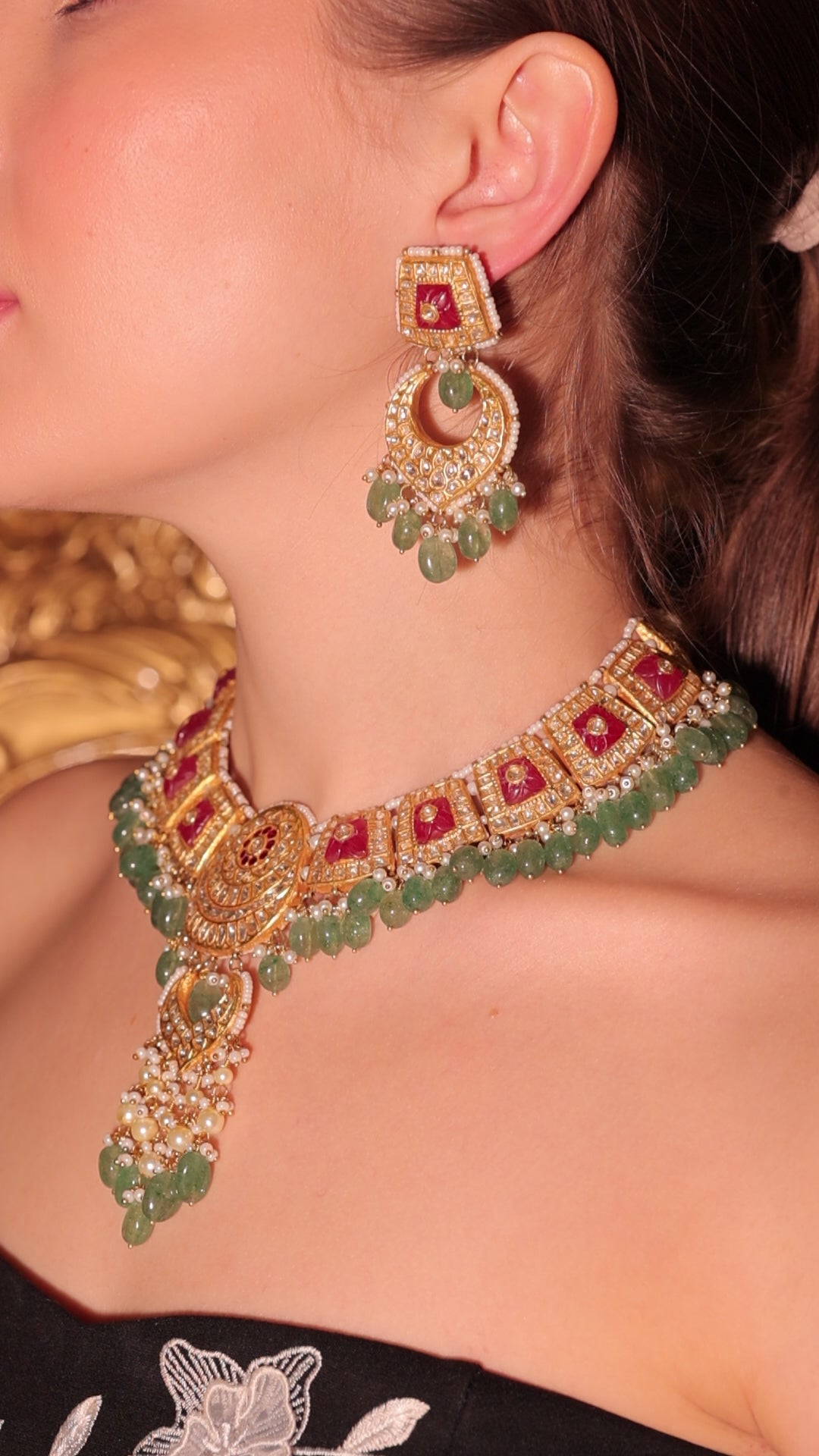 Classic & verstile, this gorgeous choker set is finely handcrafted in 22KT Gold , studded with gemstones & natural syndicate polki diamonds
